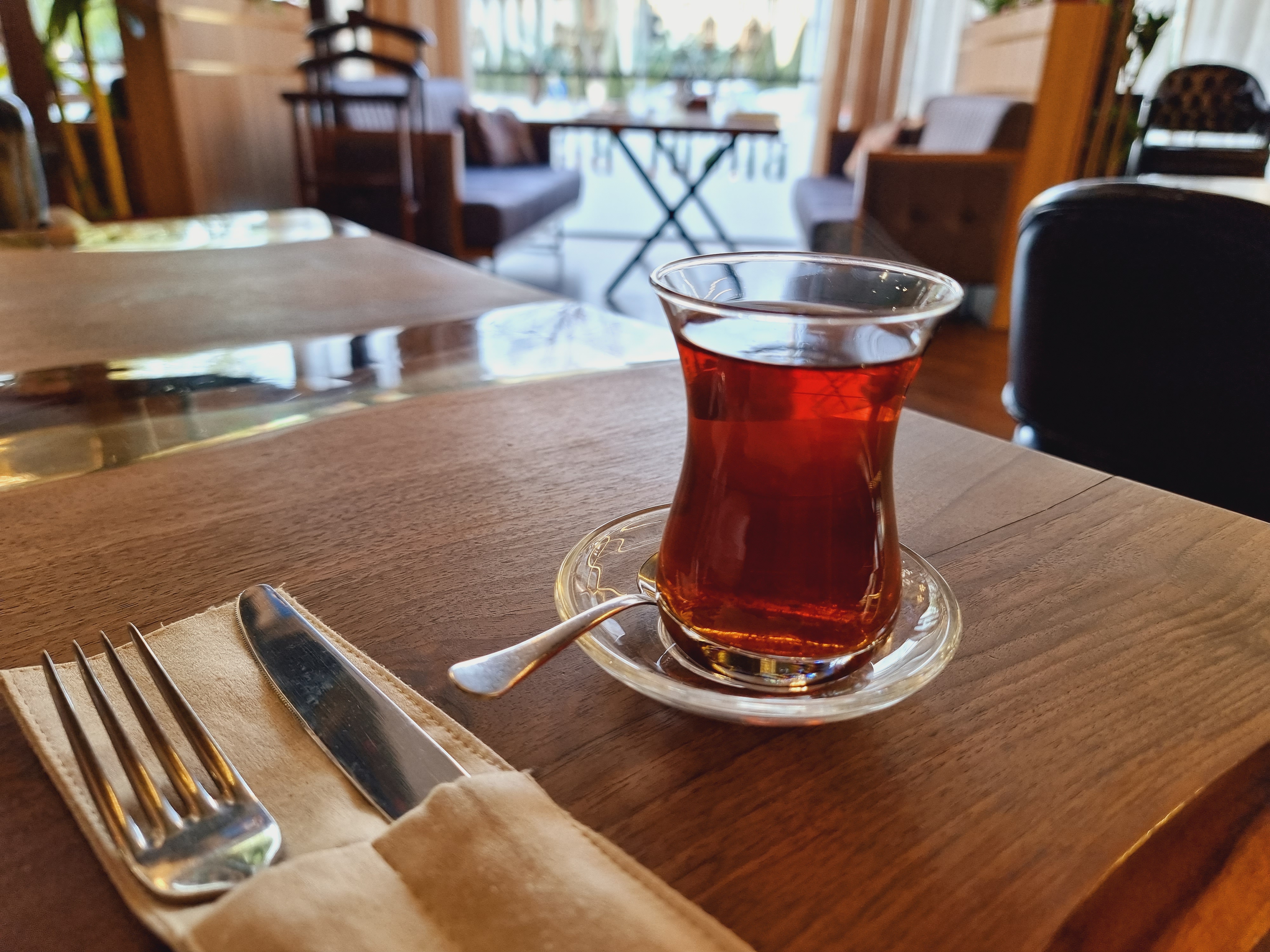 이곳에는 터키식 홍차가 기본으로 제공이 되는데요. 터키 여행해보신분이라면 아시겠지만 꼭 저런 잔에 차를 제공해 주더라고요. 뜨거운 차는 바로 마시려고 하면 잔이 뜨거워서 먹기 좀 불편하긴 합니다.